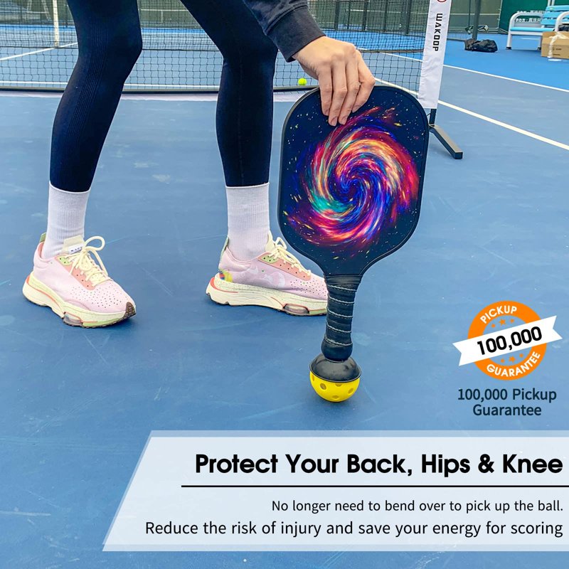 This 2-piece set of silicone Pickleball Ball Retrievers quickly and easily attaches to the bottom of any pickleball paddle, eliminating the need to bend down and pick up balls. The set of two retrievers fits any pickleball paddle, making it easy to quickly and conveniently pick up with your paddle.