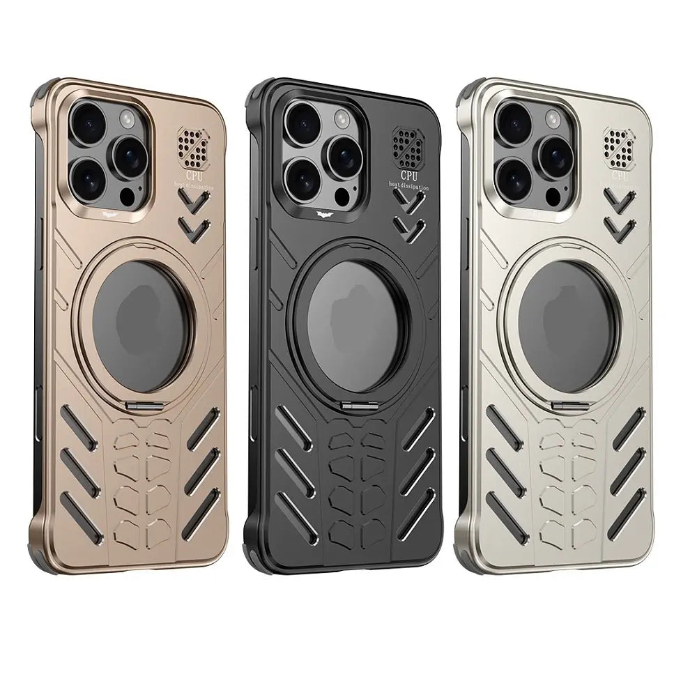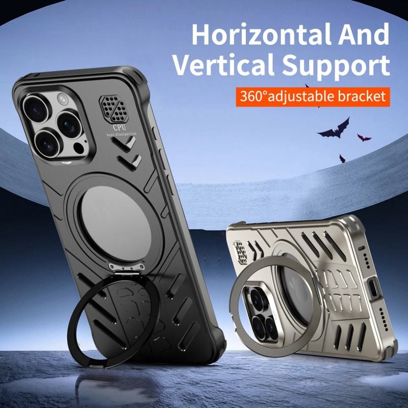 Aluminum Metal Hollow Magnetic Phone Case For iPhone 15 16 Pro Max Shockproof Armor Bumper With 360 Rotating Hidden Kickstand