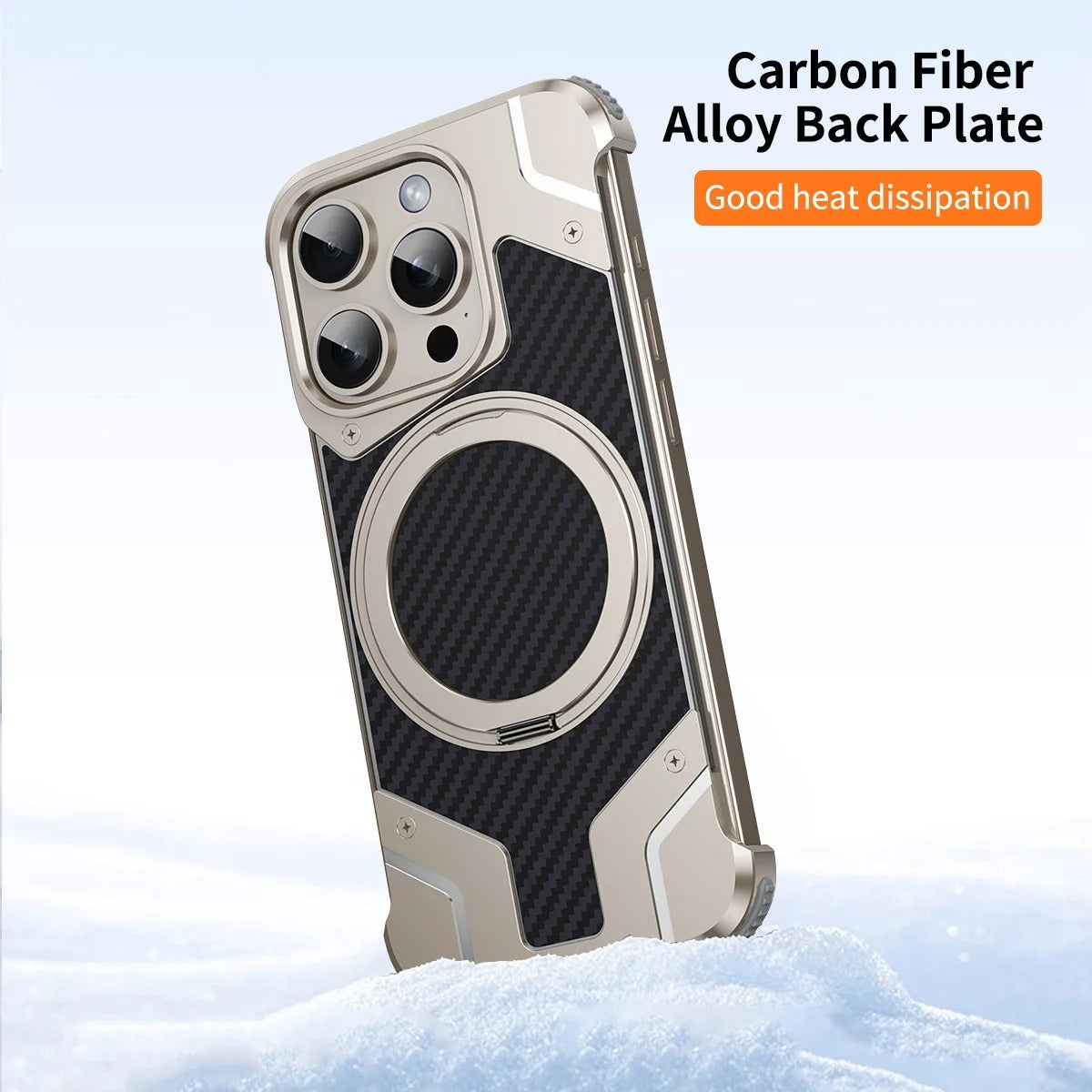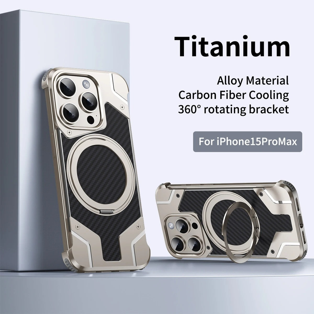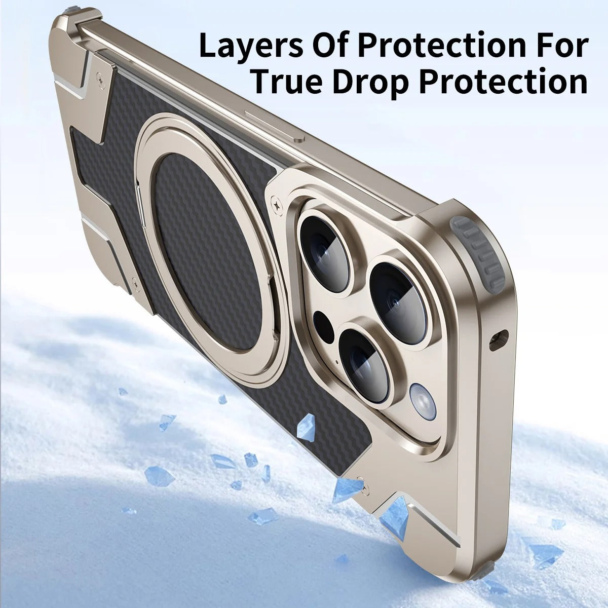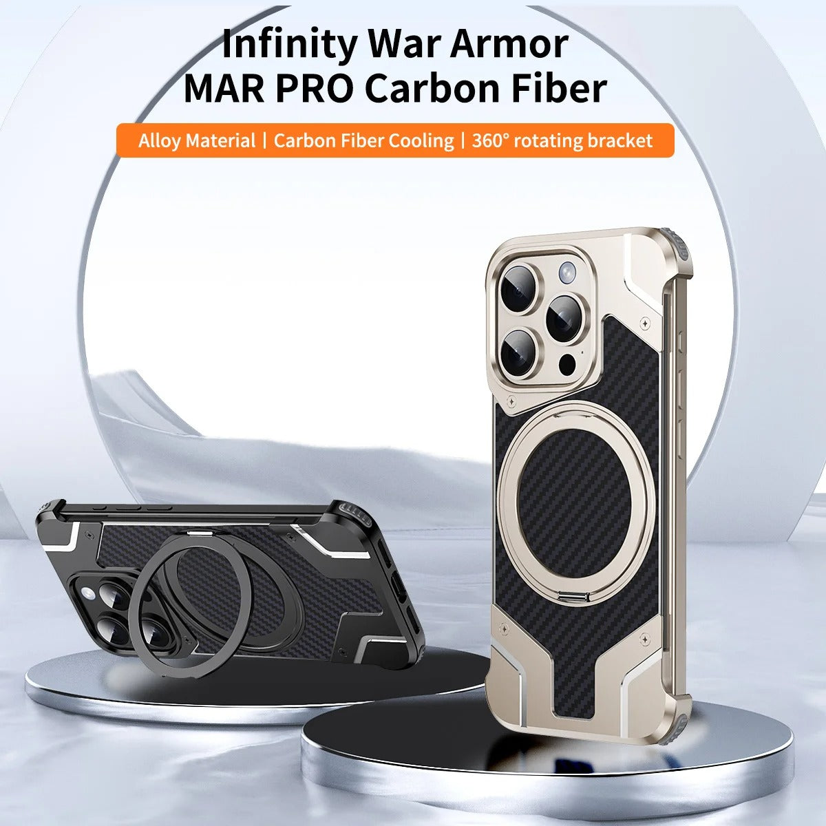 Carbon Fiber Metal Anti Fall Case for iPhone 16 15Pro Max Magnetic 360 Rotating Bracket Aluminium Alloy Shockproof Case