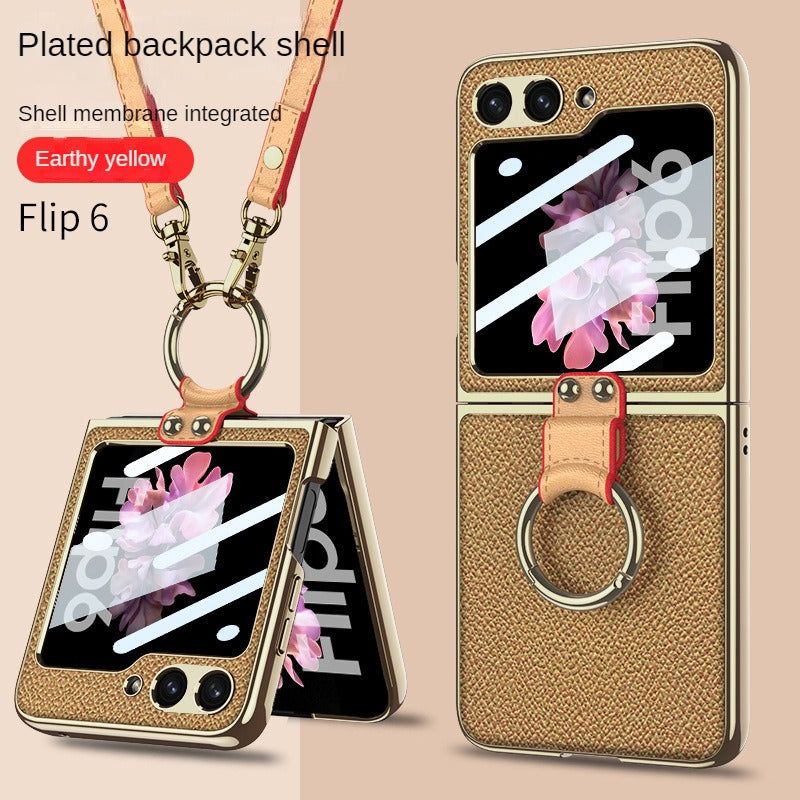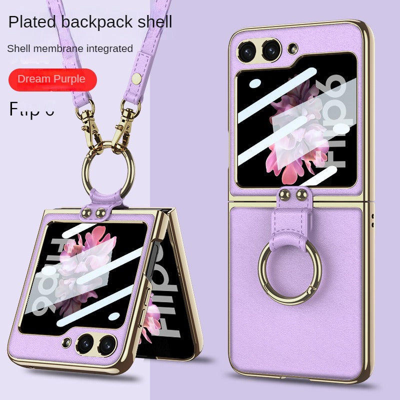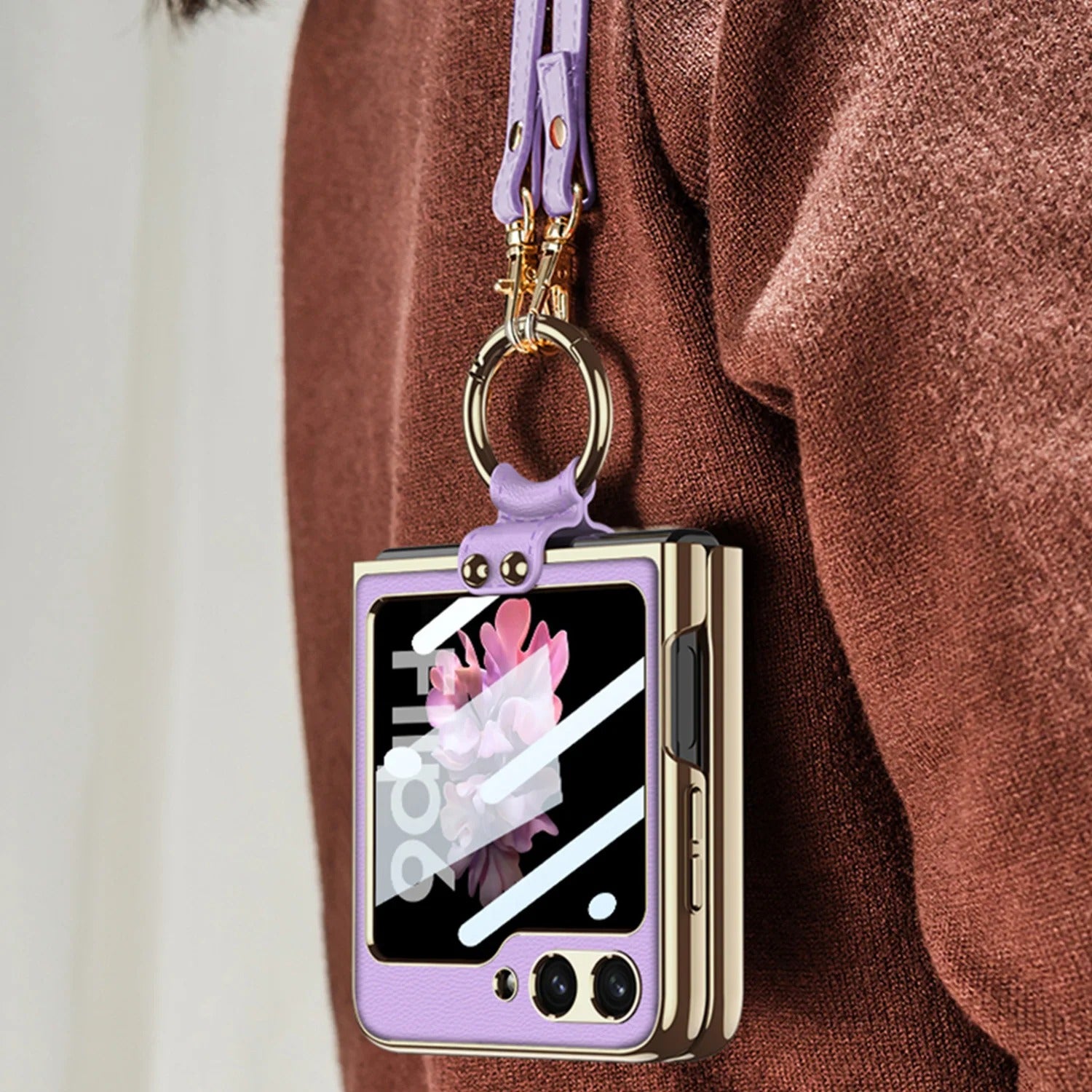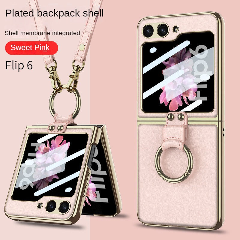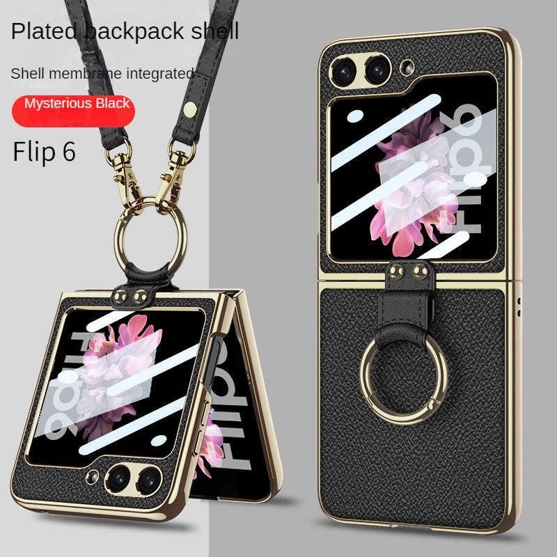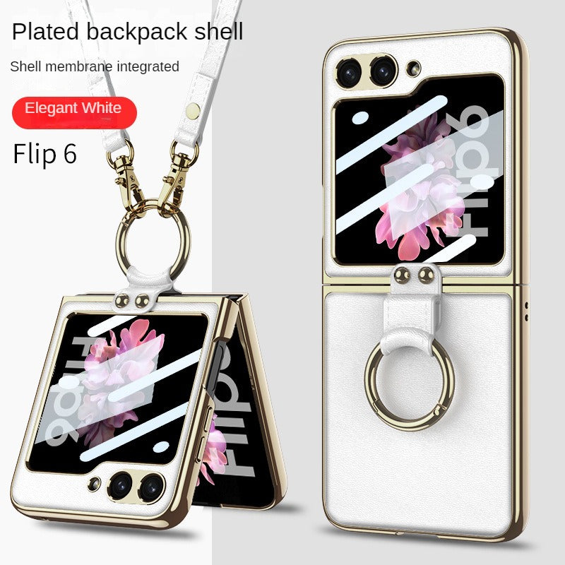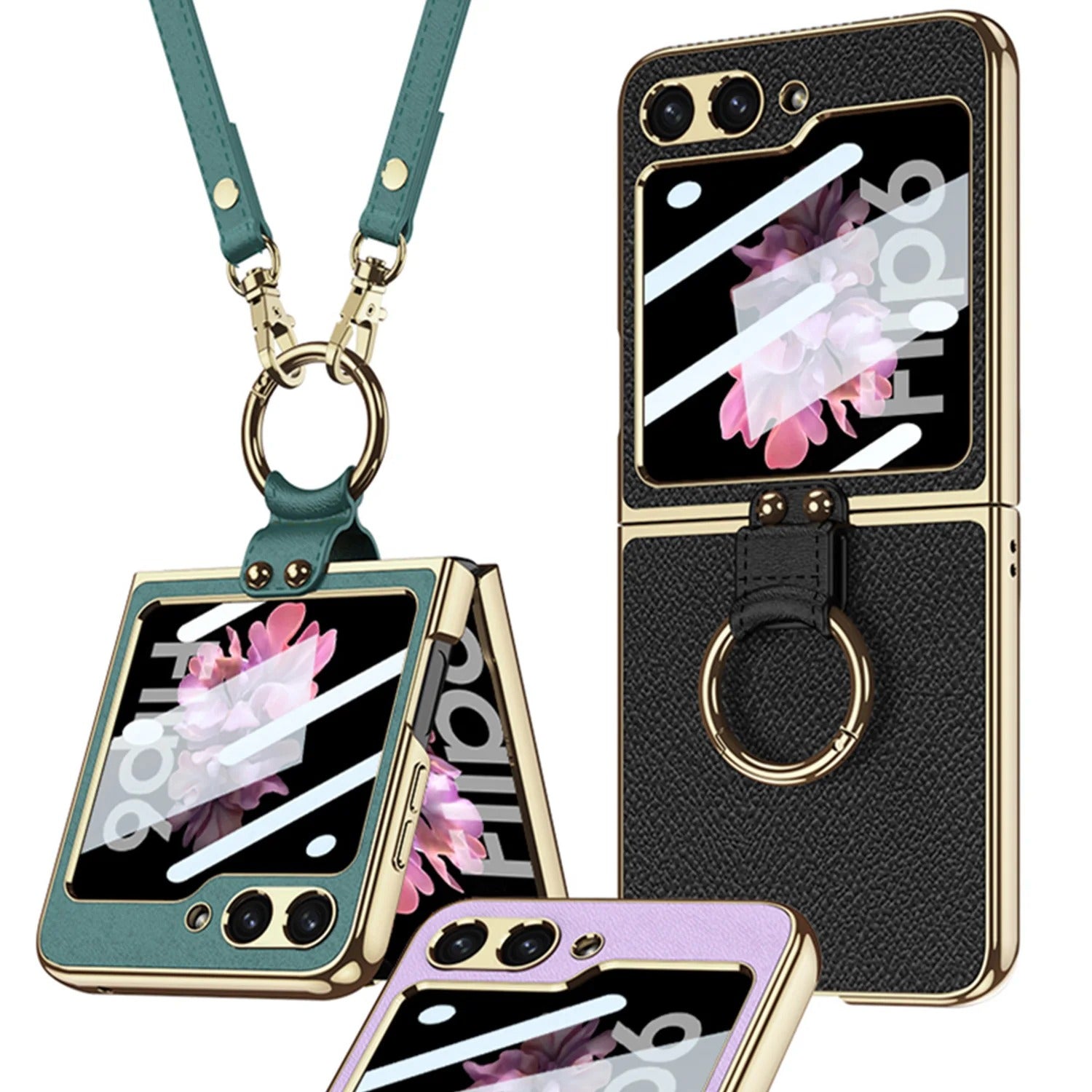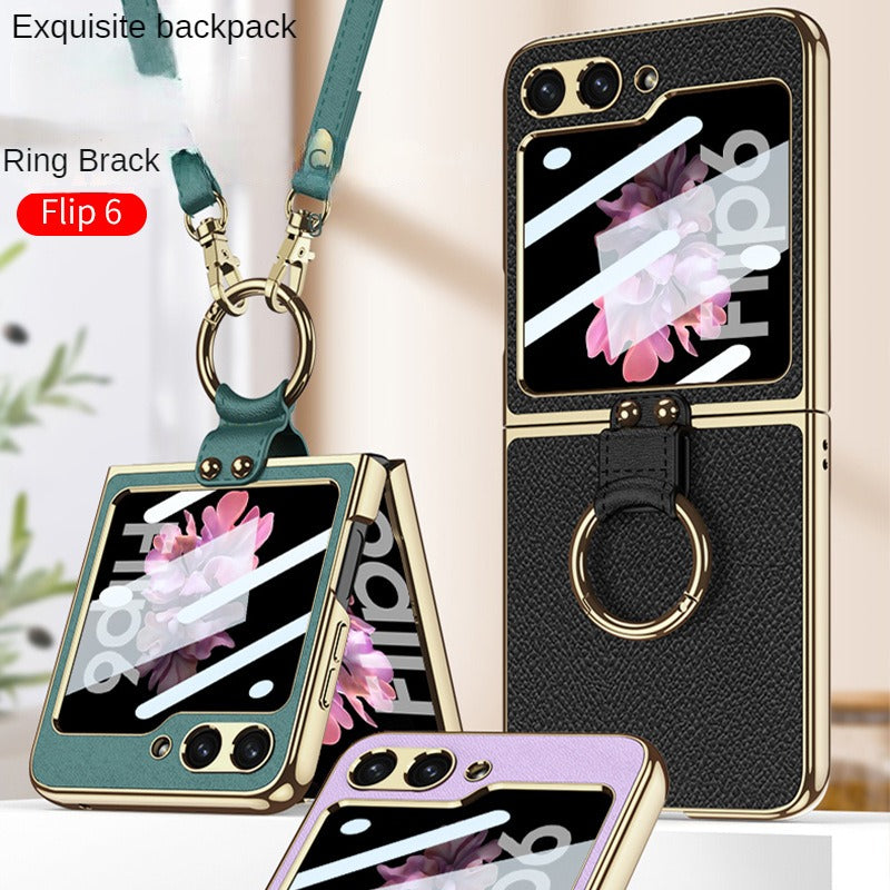 Electroplated Leather Strap Hard Case Back Screen Glass Ring Stand For Samsung Galaxy Z Flip 6