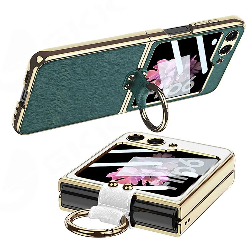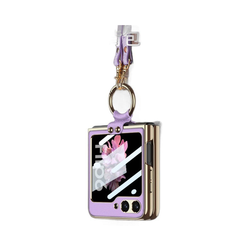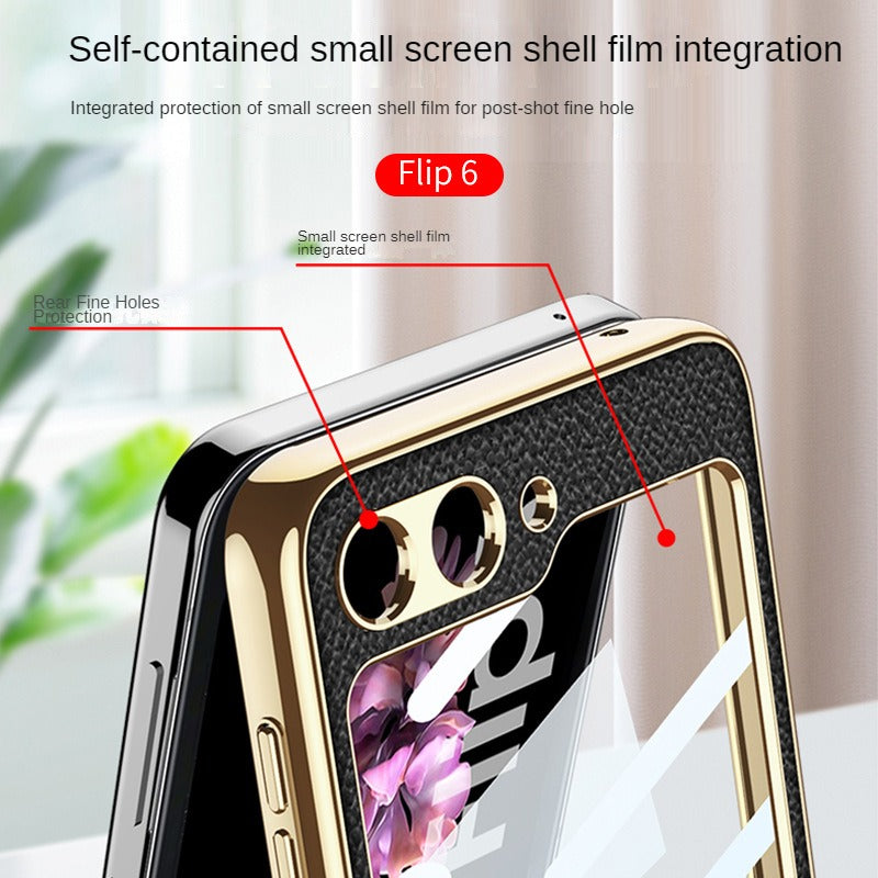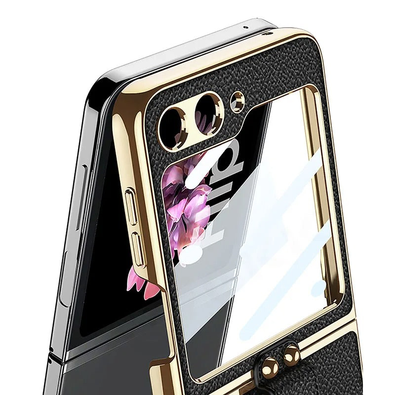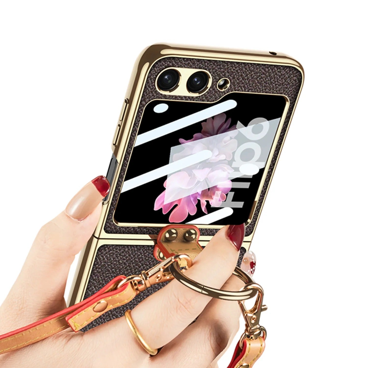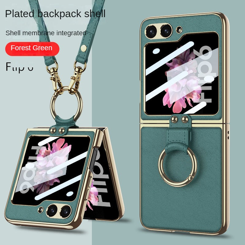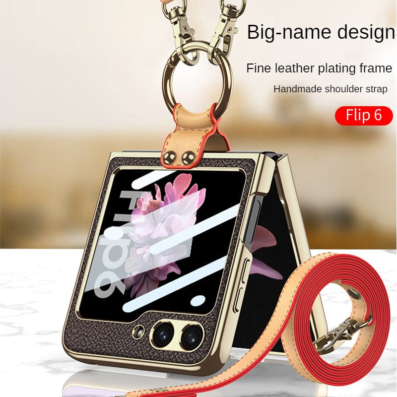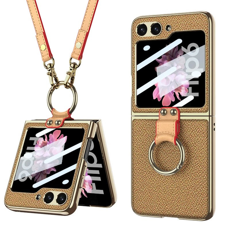 Electroplated Leather Strap Hard Case Back Screen Glass Ring Stand For Samsung Galaxy Z Flip 6
