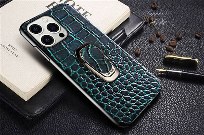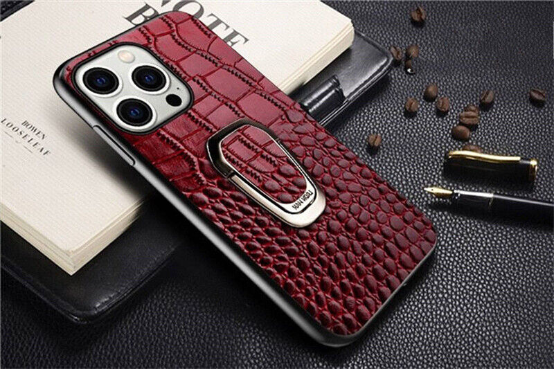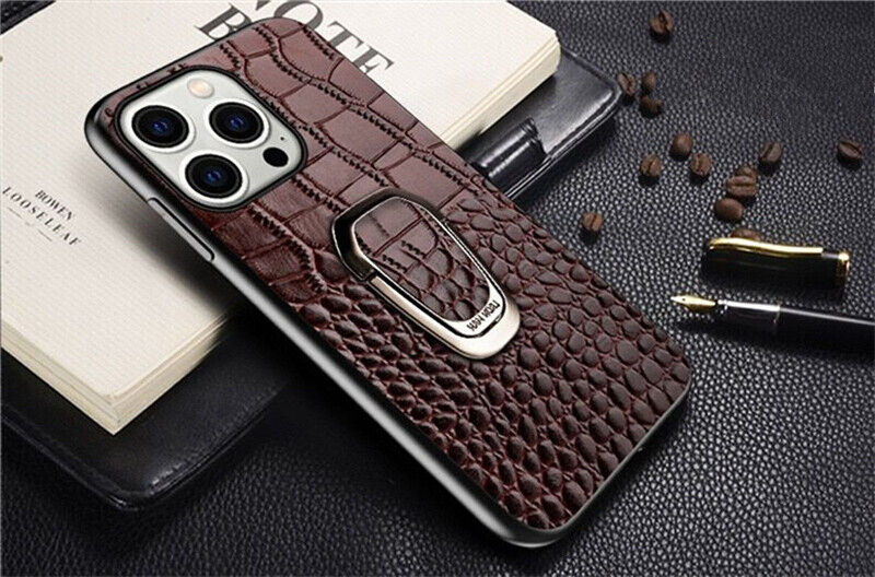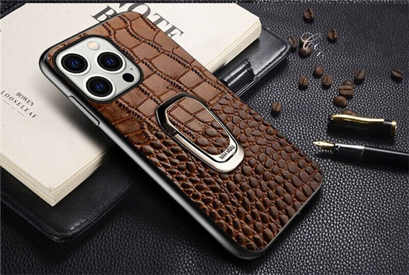 Genuine Leather Phone Case With Metal Ring Bracket For Apple iPhone 15 12 13 14 Pro Max 15Pro