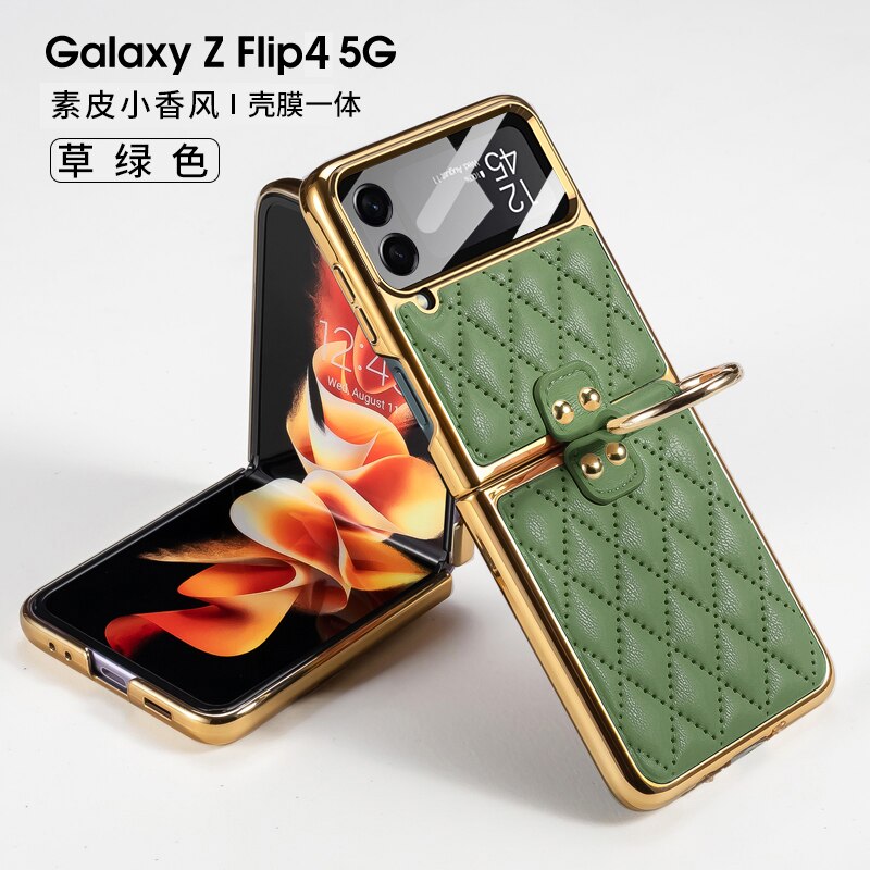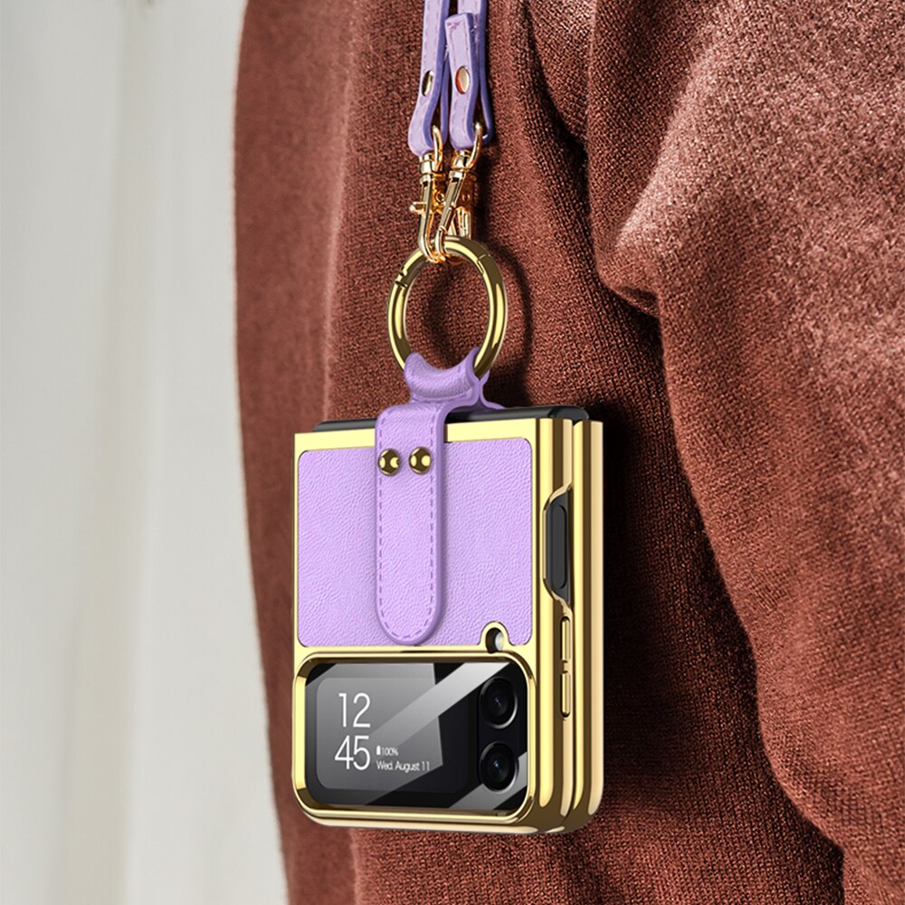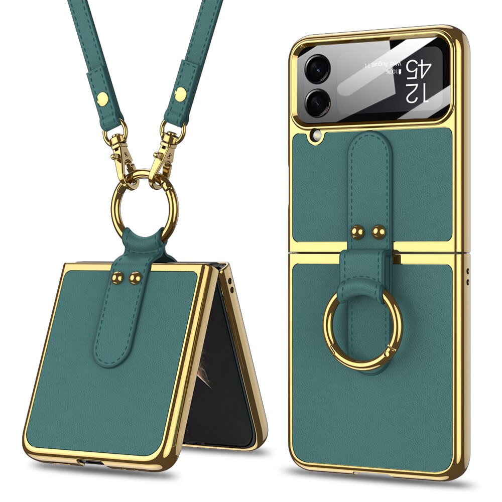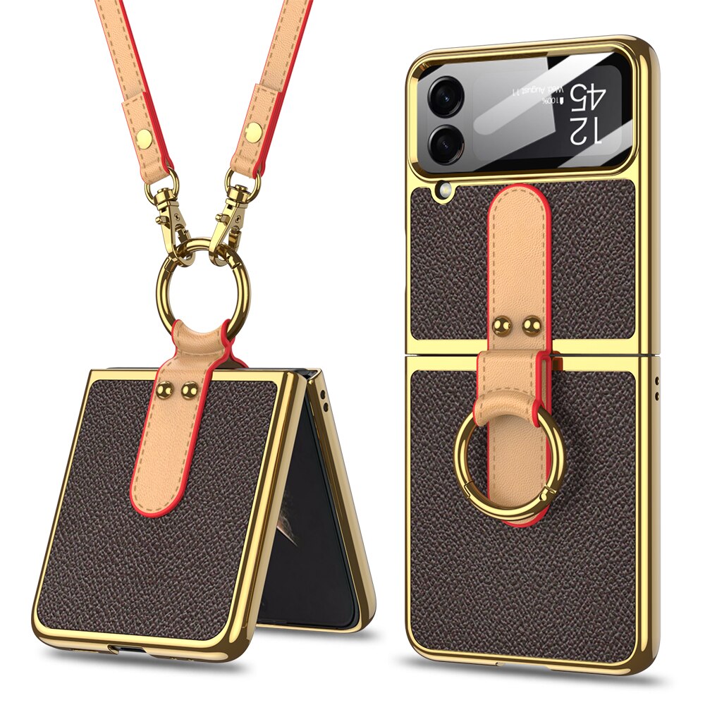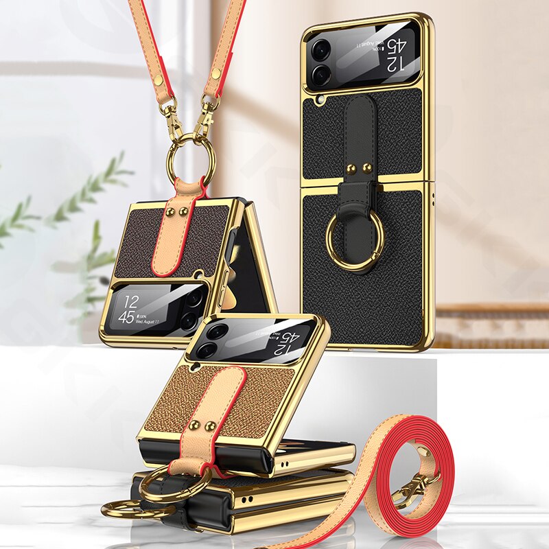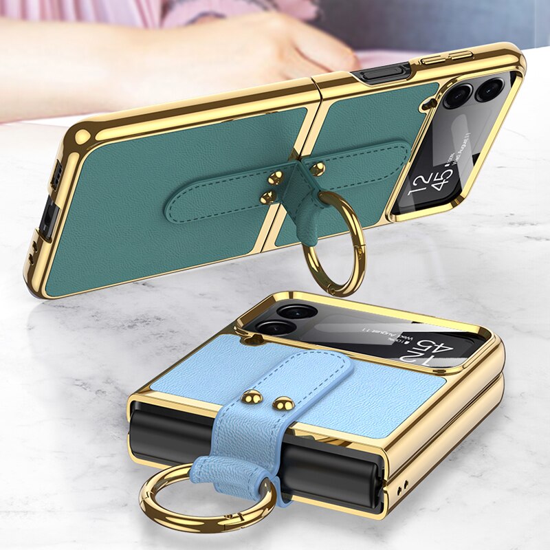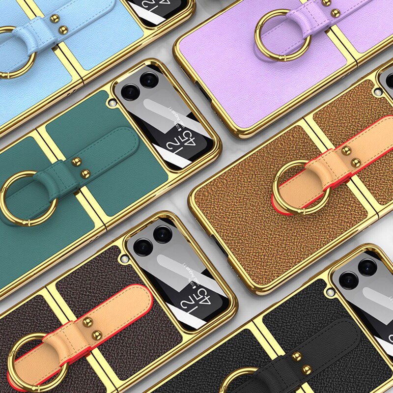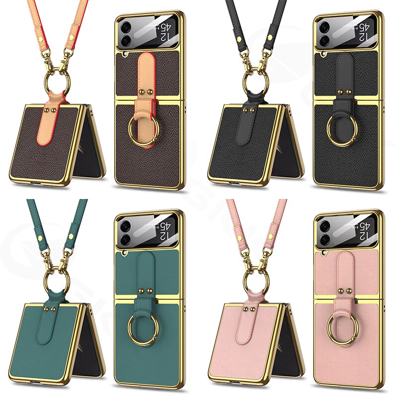 Leather Plating Ring Stand Strap Case Cover For Samsung Galaxy Z Flip 5 4 Luxury Screen Glass Protection For Galaxy Z Flip5 4 Case