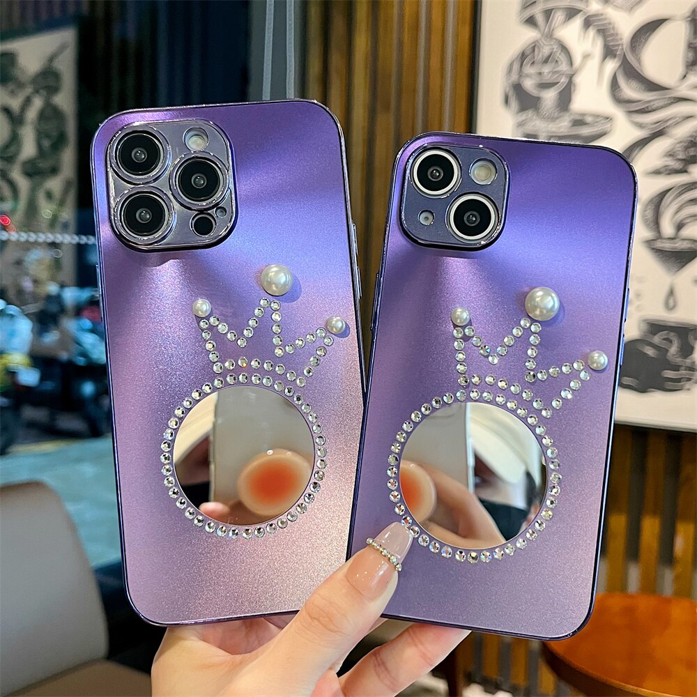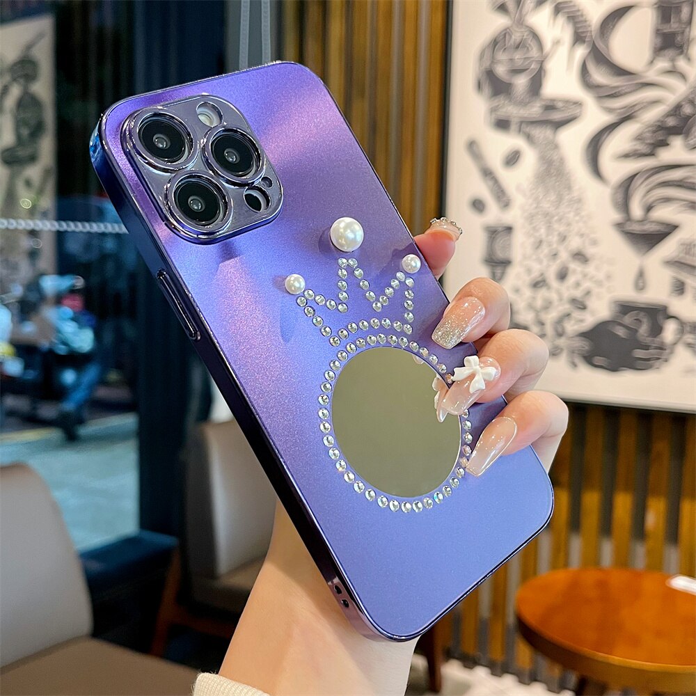 Luxury Glitter Diamond Crown Phone Case for iPhone 14 13 Pro Max 12 11 Gradient Mirror Pearl Make Up Cover for iPhone 14 Plus