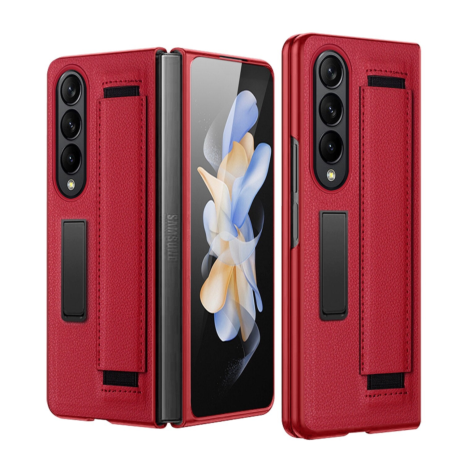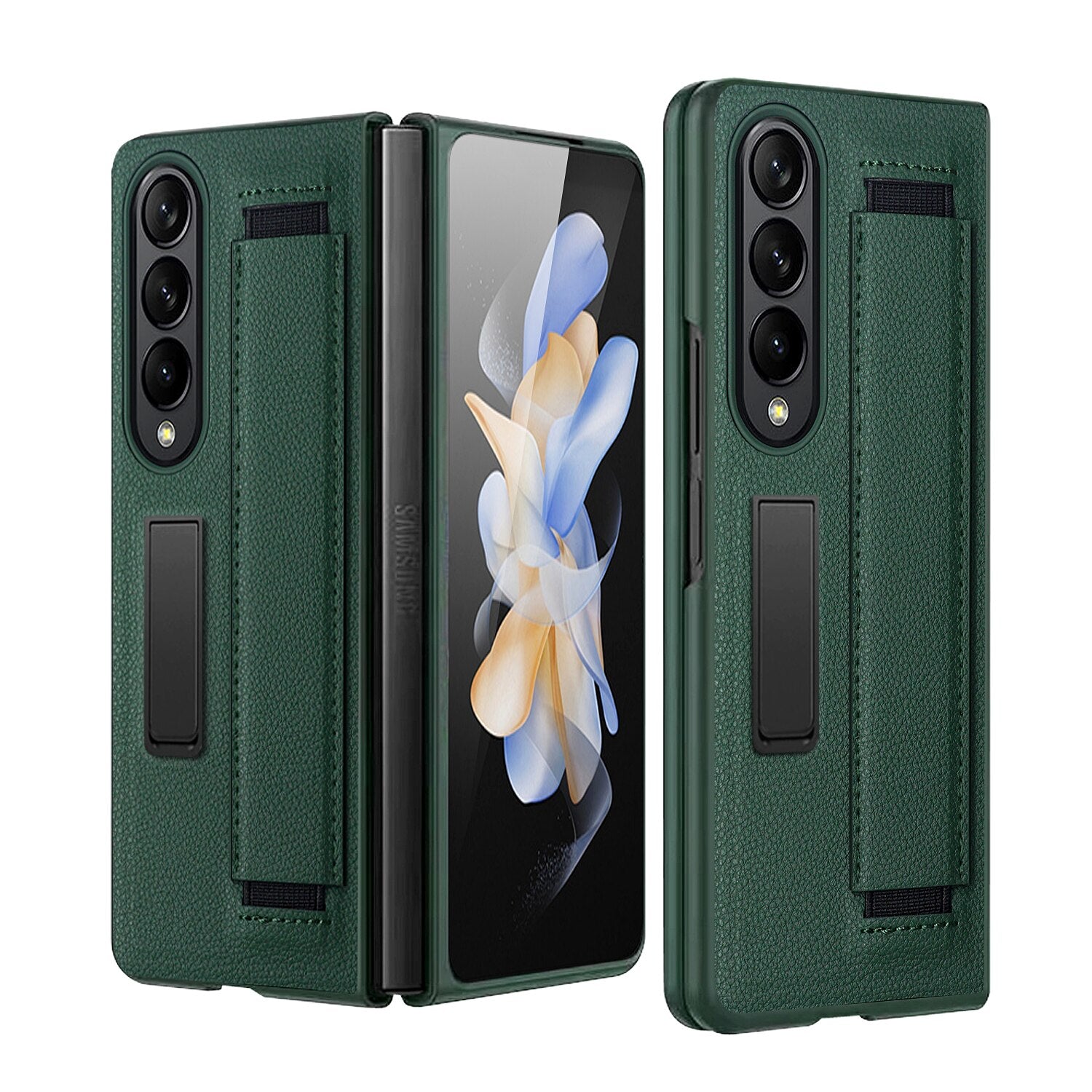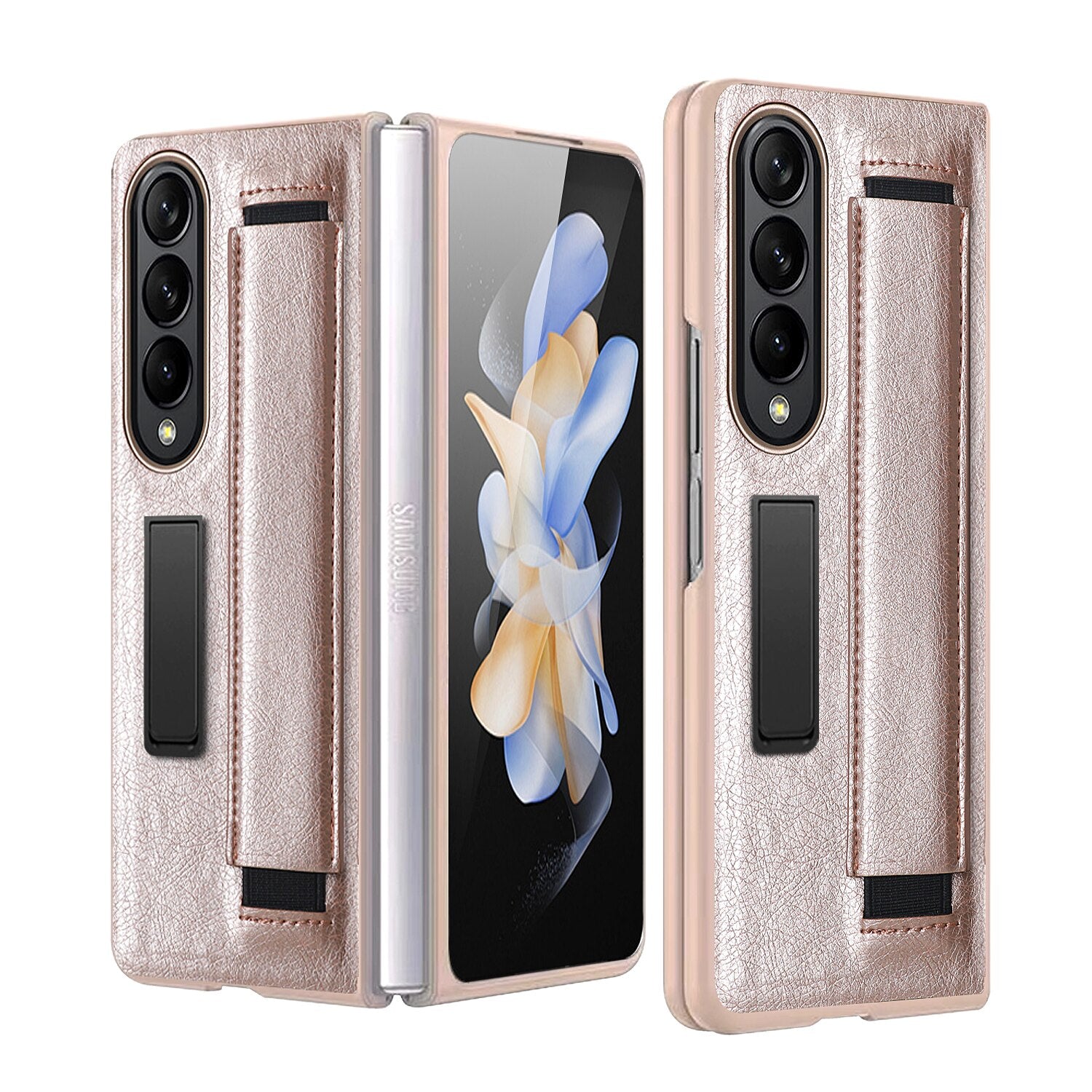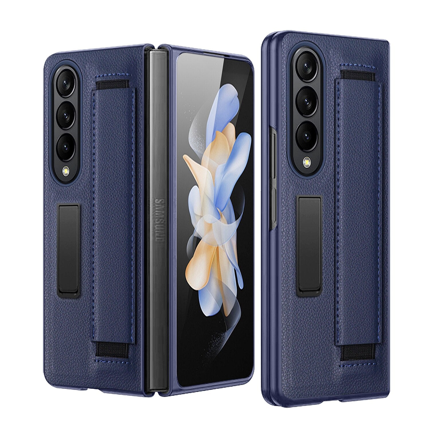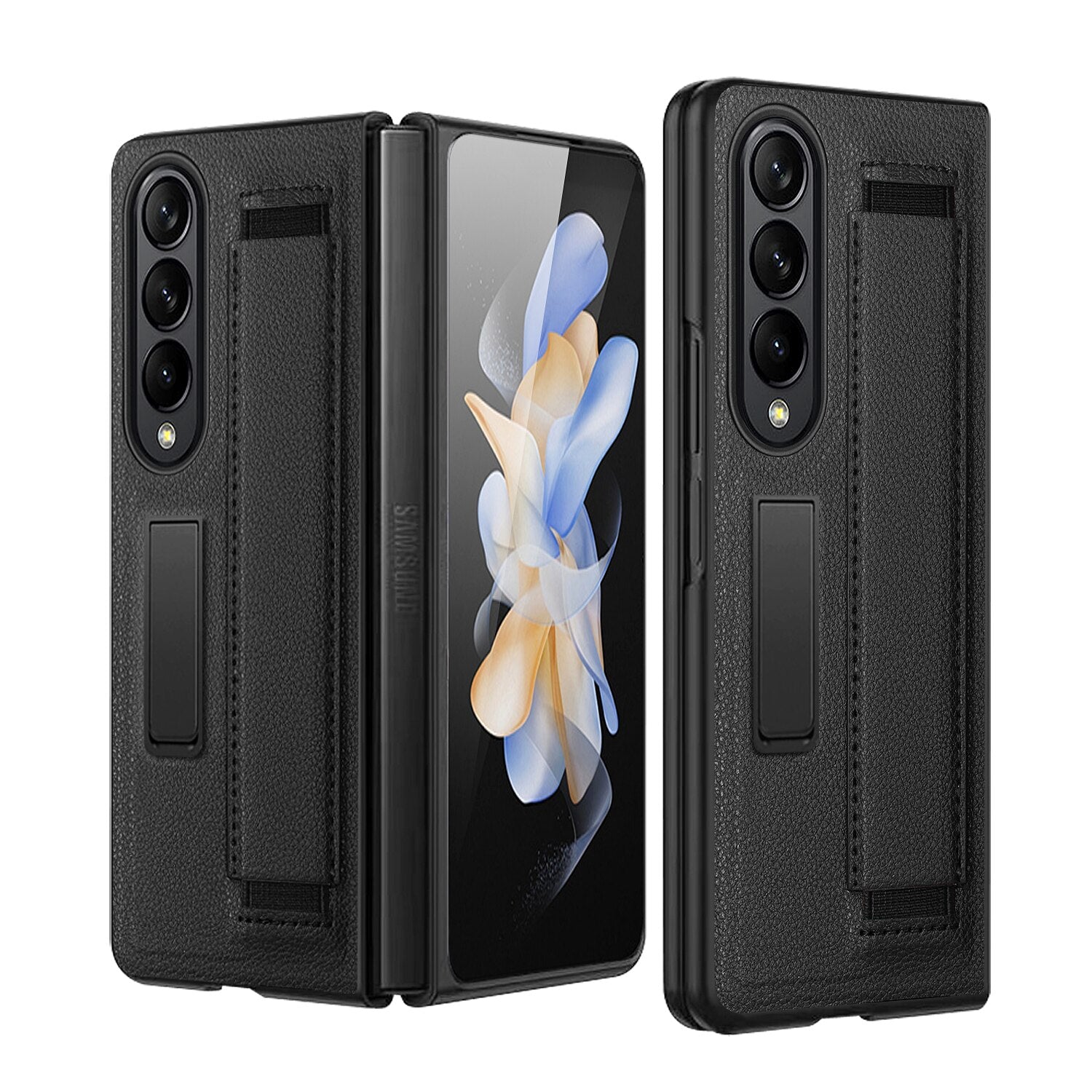 Luxury Leather Hard PC Phone Cover for Samsung Galaxy Z Fold 4 Case with Wrist Band Glass Film Screen Protector Kickstand