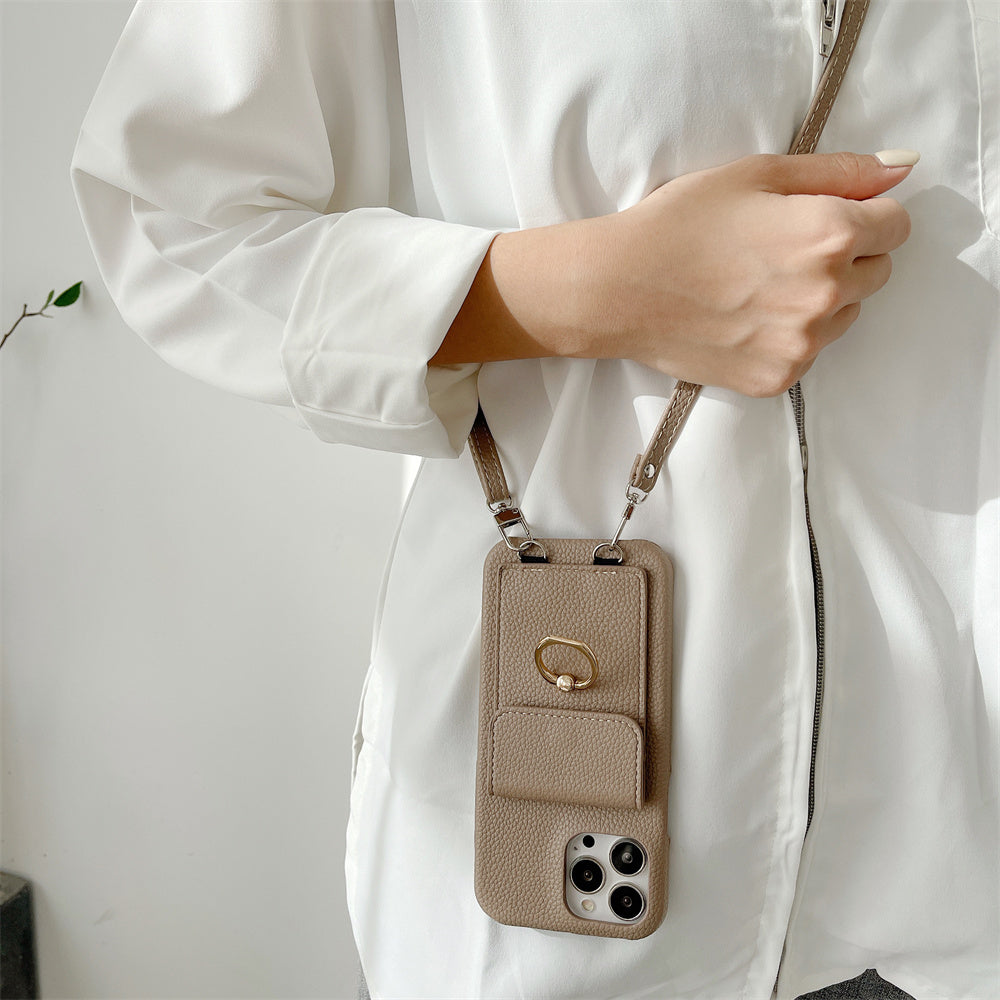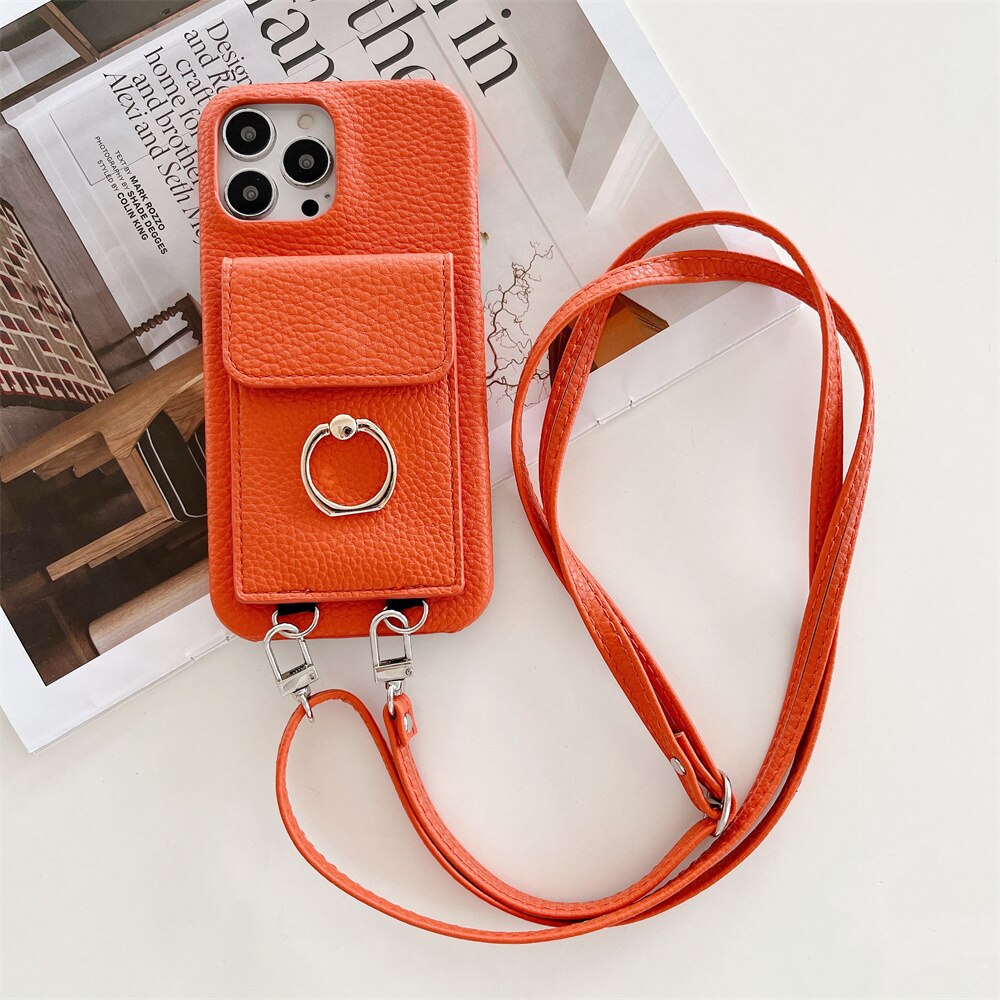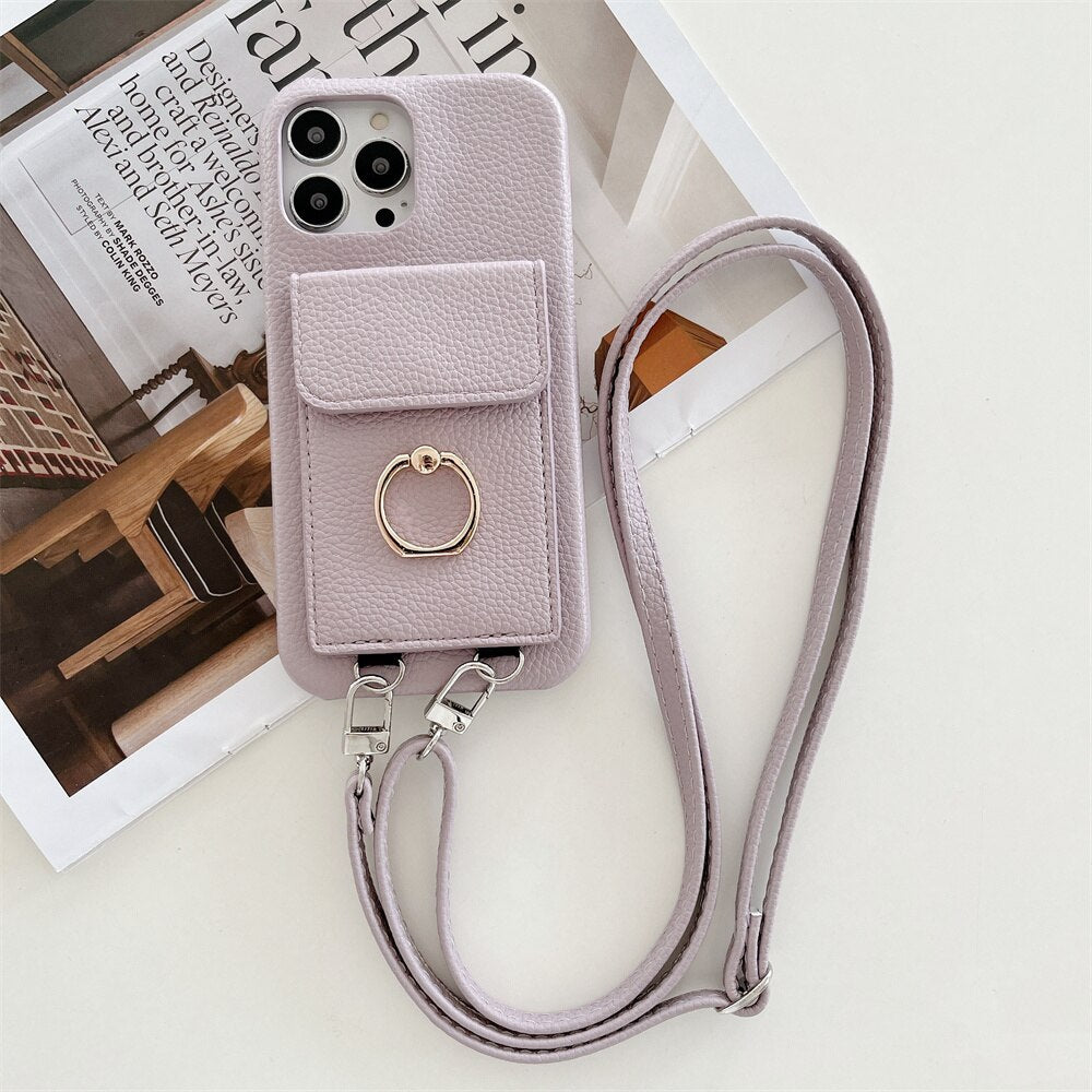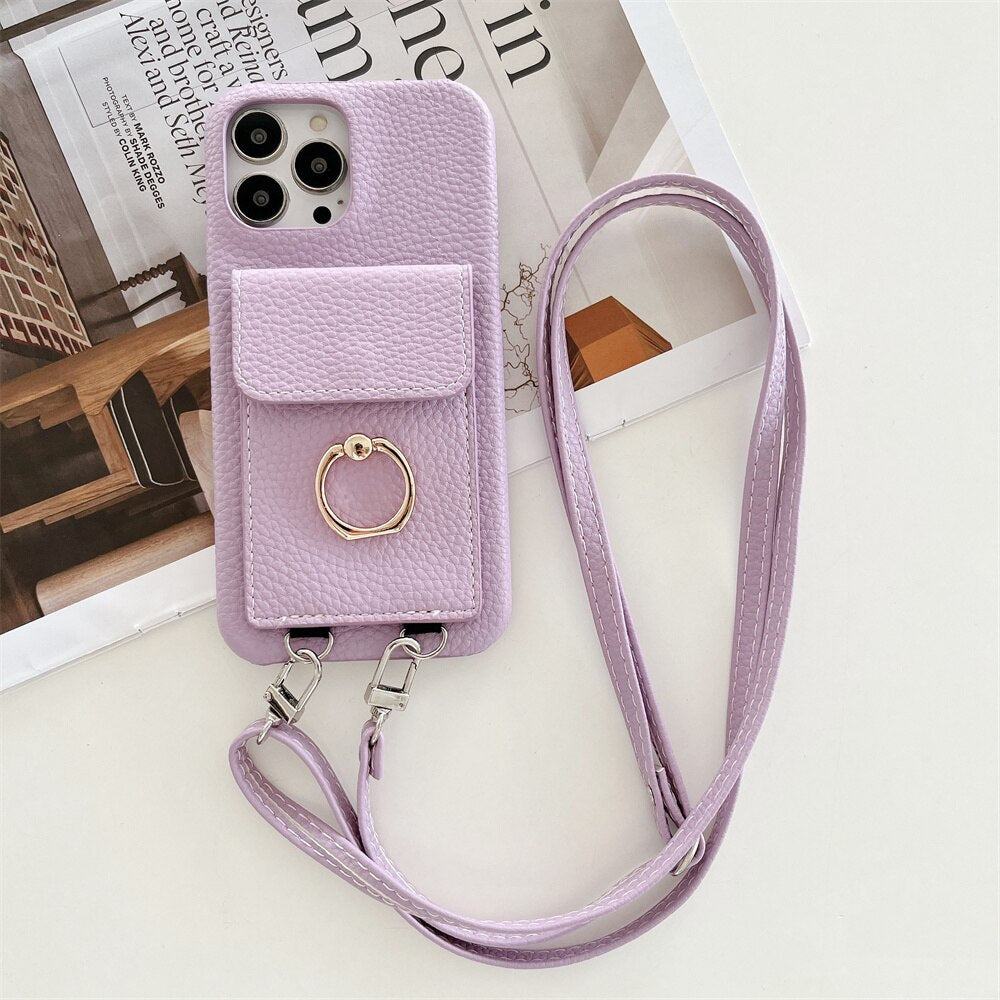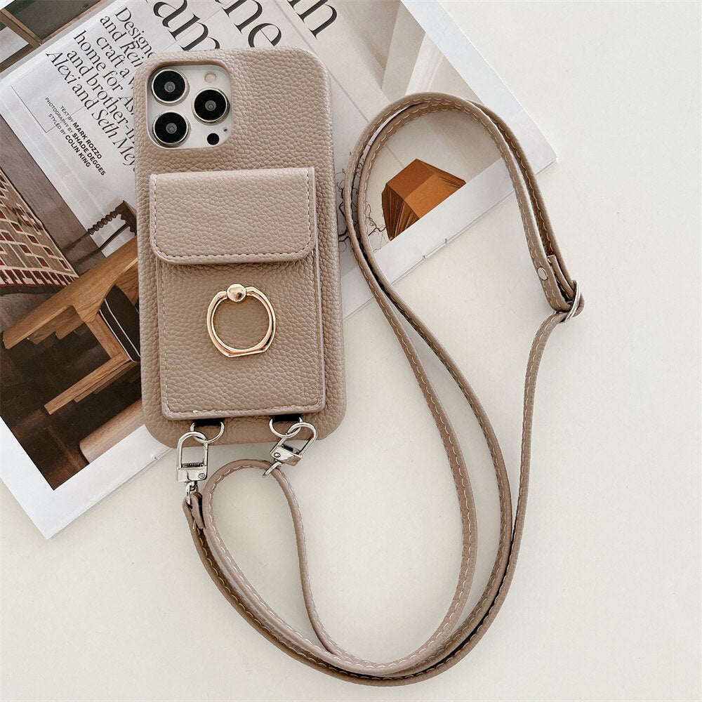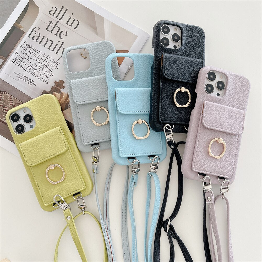 Luxury Lychee Leather Card Wallet Phone Case With Ring Buckle Bracket Crossbody Lanyard Case For iPhone