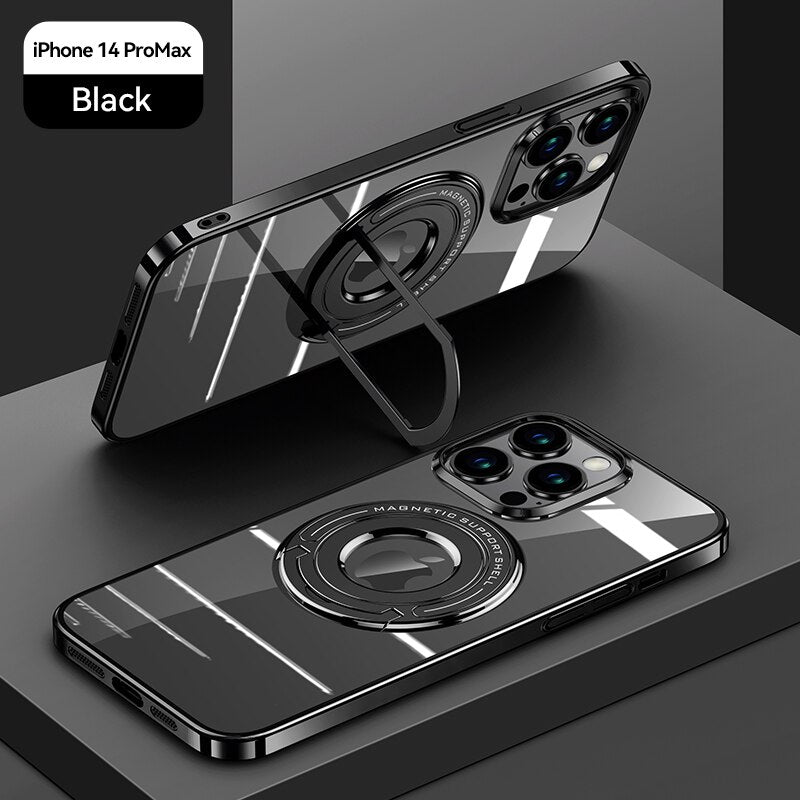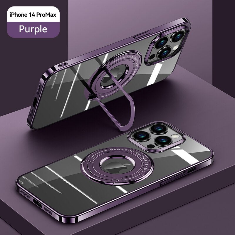 A perfect accessory for your iPhone 14, 13, or 12. Our Luxury Magsafe Magnetic Phone Case is made with PC and TPU for durability and features a metal invisible bracket stand for convenient hands-free use. It also has a ring holder for additional security. The electroplated case and frame transparent PC phone case design adds a luxury look to your device.
