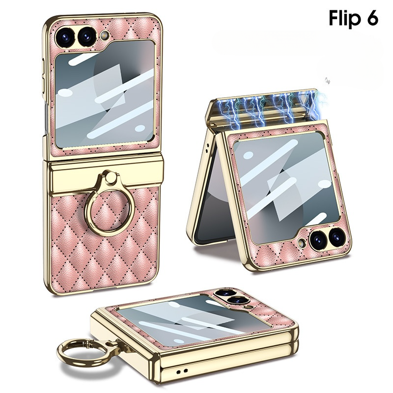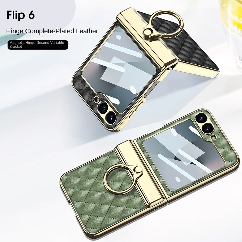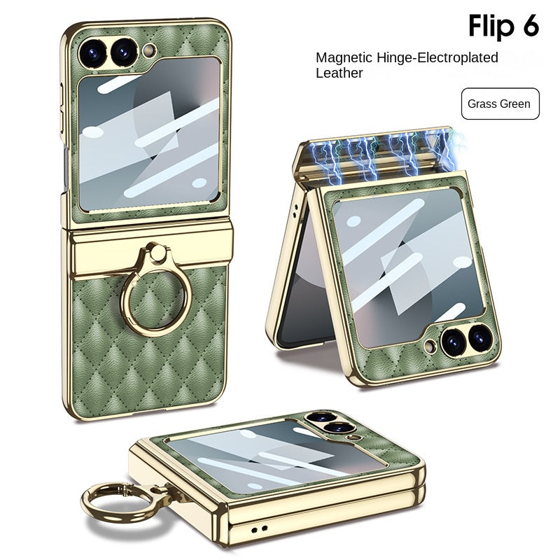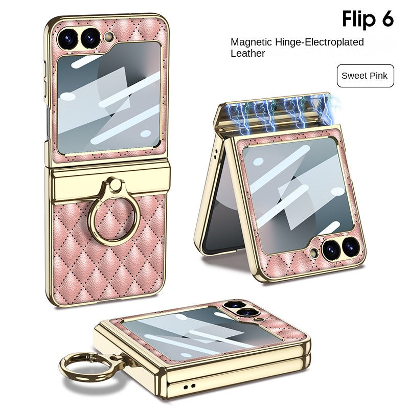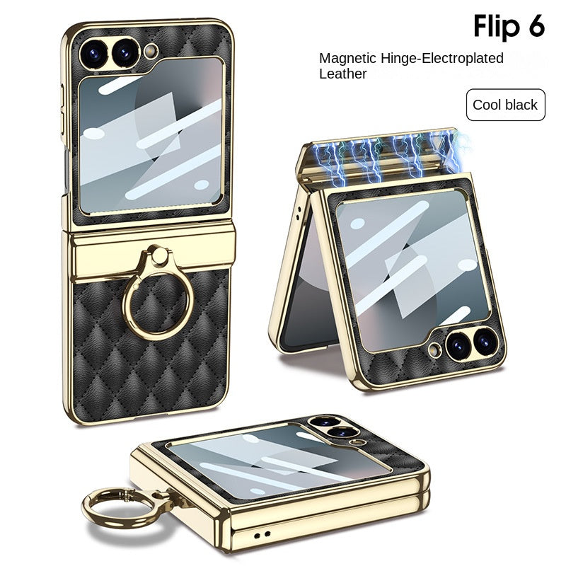 Luxury PU Leather Film Electroplated Ring Holder Hinge Magnetic Phone Case For Samsung Galaxy Z Flip 6