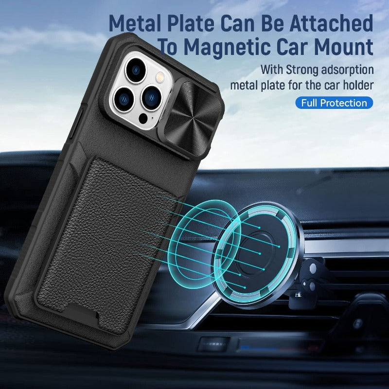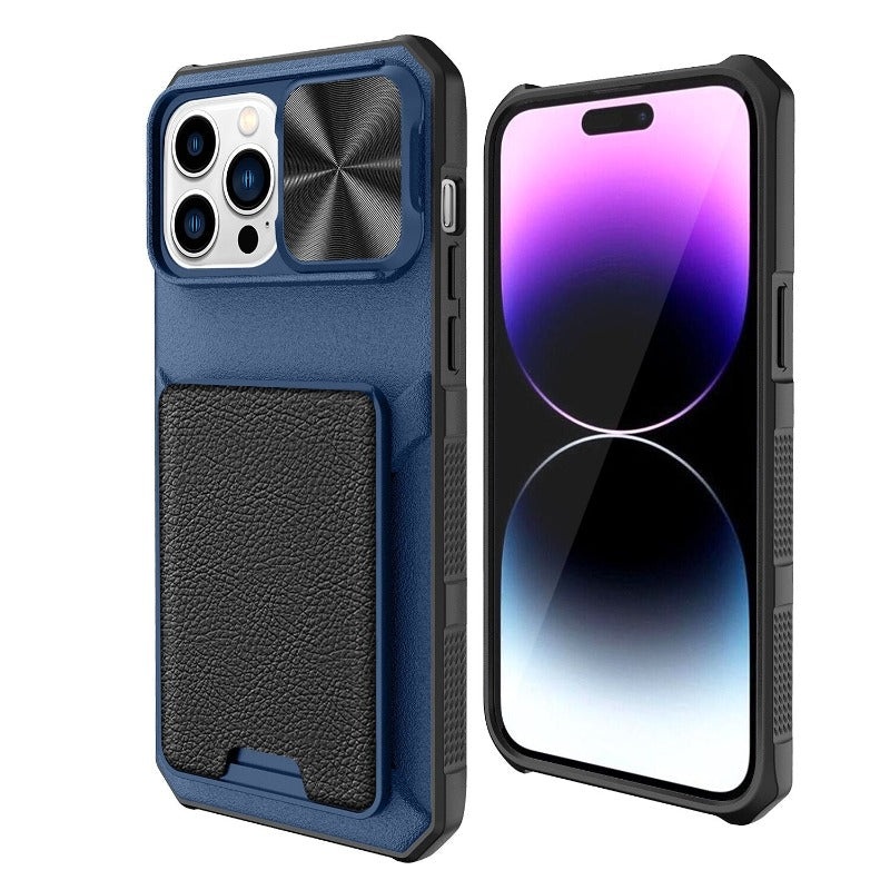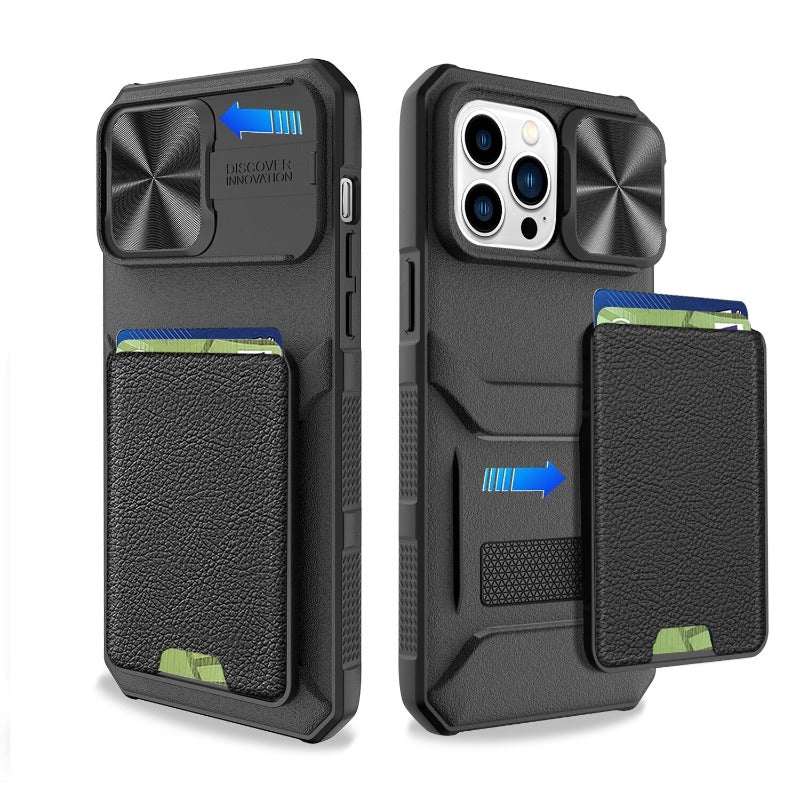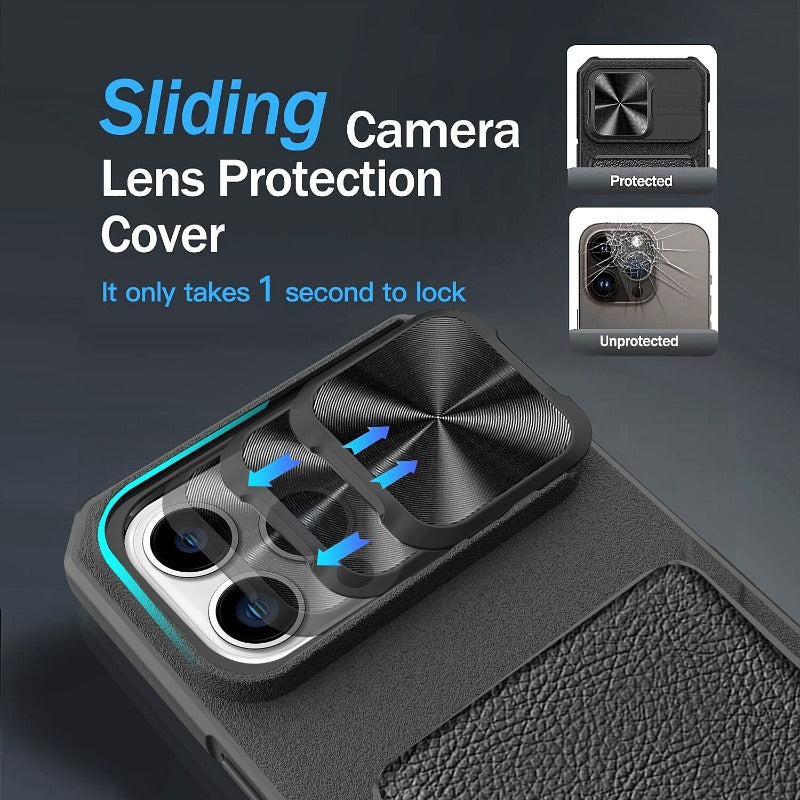 Slide Camera Lens Protection Leather Wallet Card Holder Phone Case For iPhone