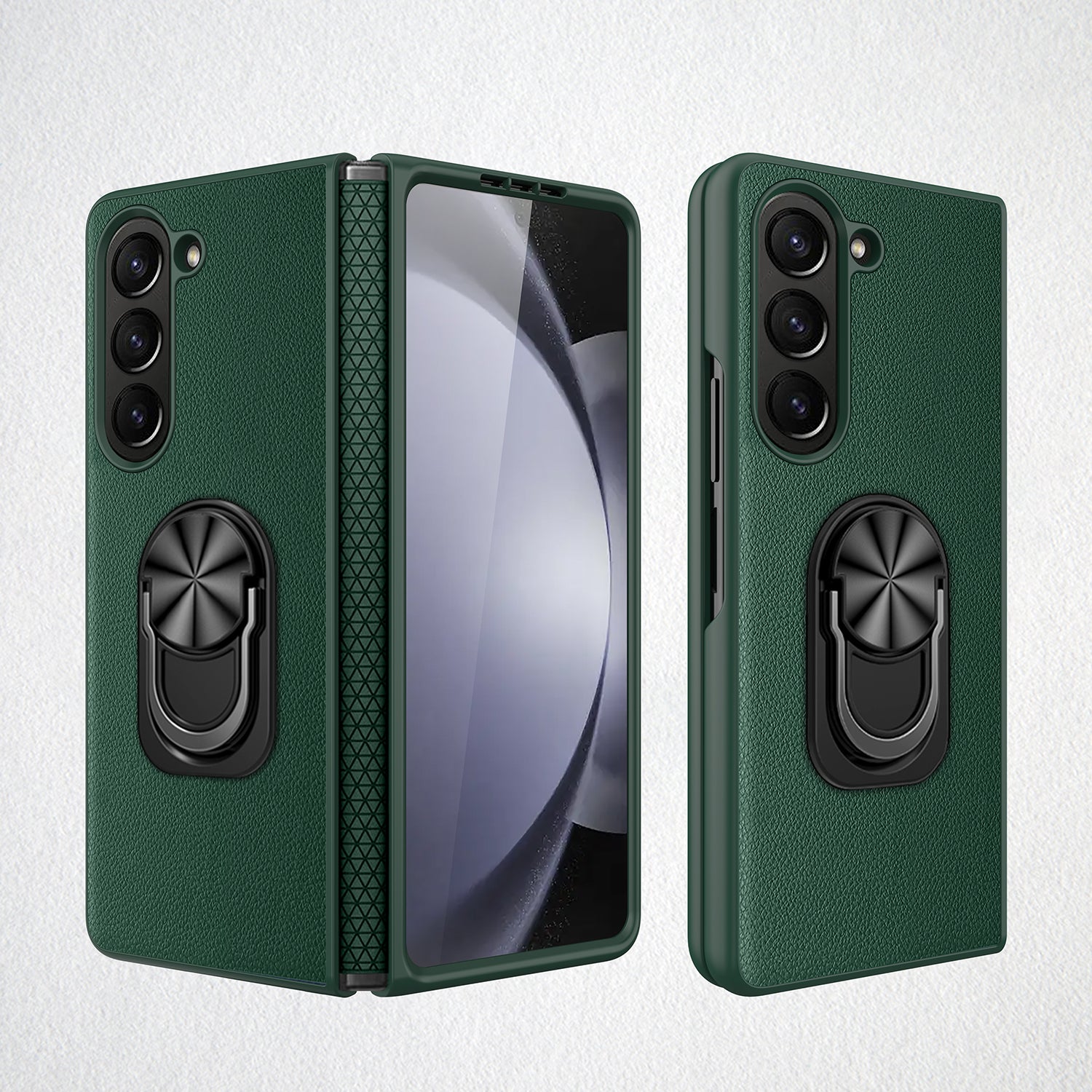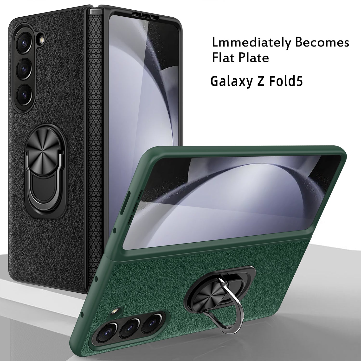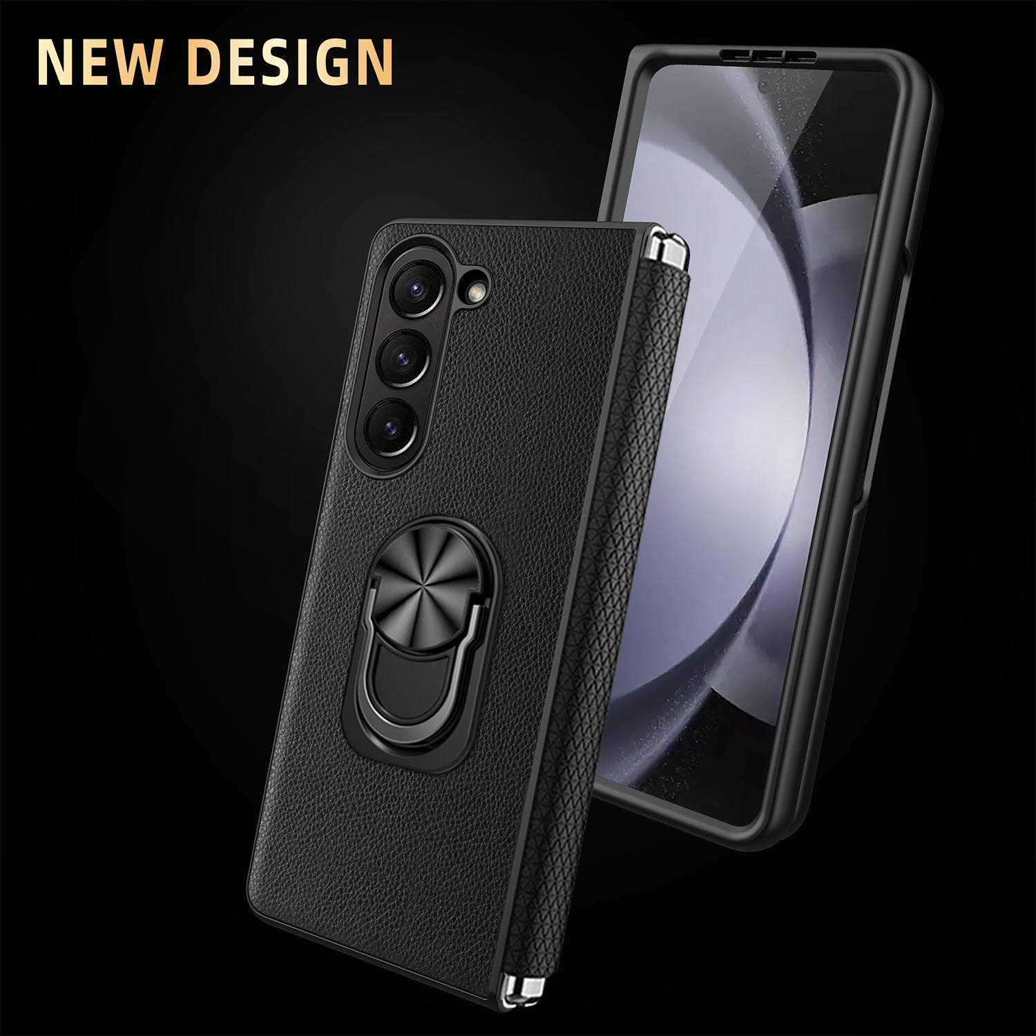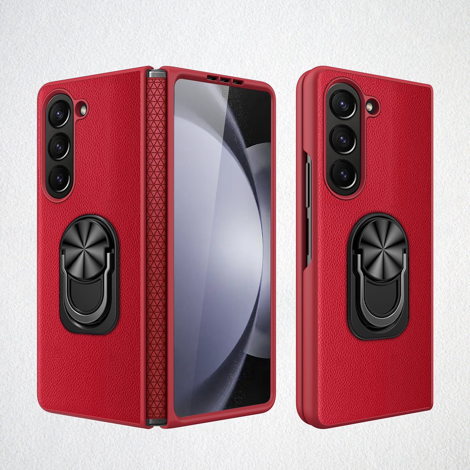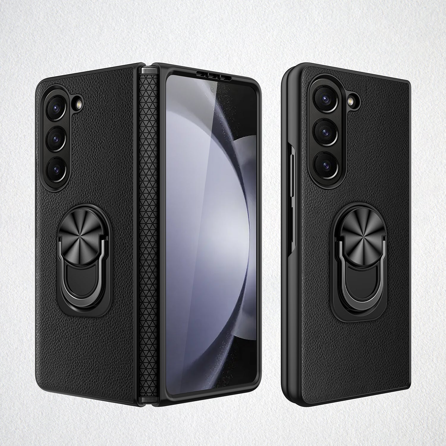 For Samsung Galaxy Z Fold 5 4 Case Luxury Lychee Pattern Leather Ring Holder Folding Hinge Screen All-inclusive Shockproof Cover