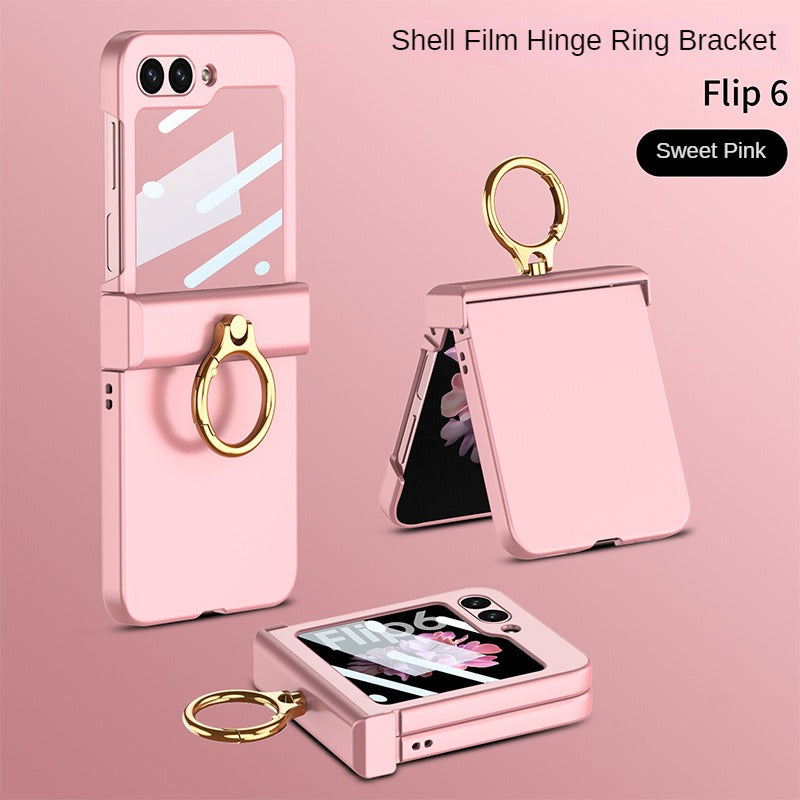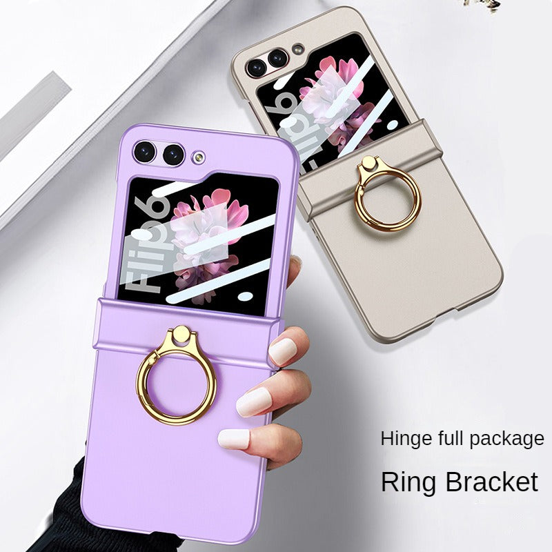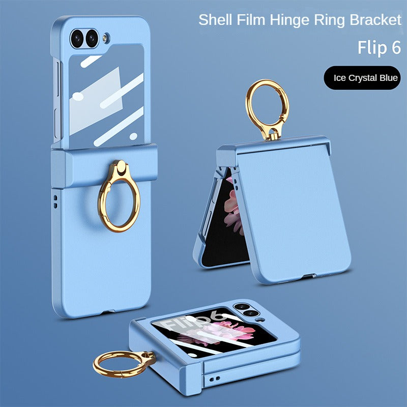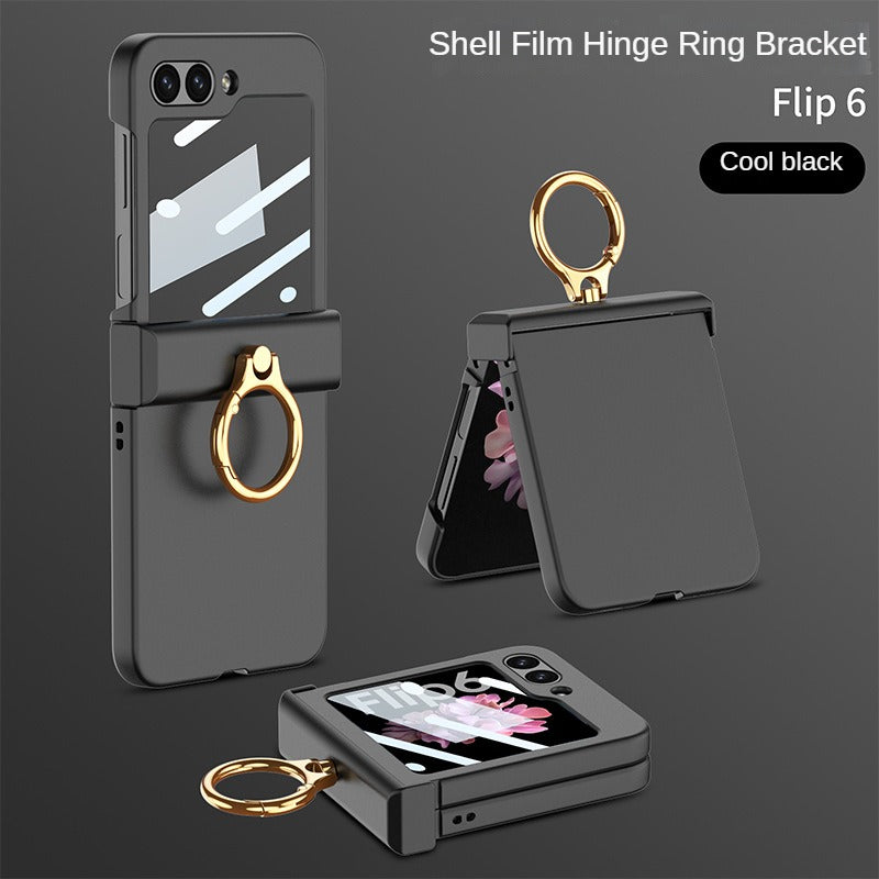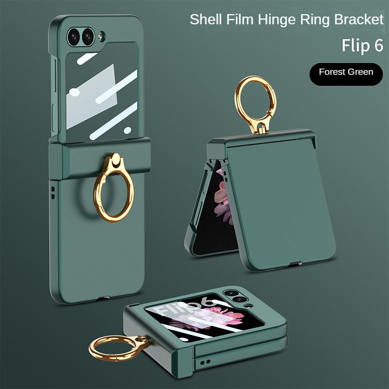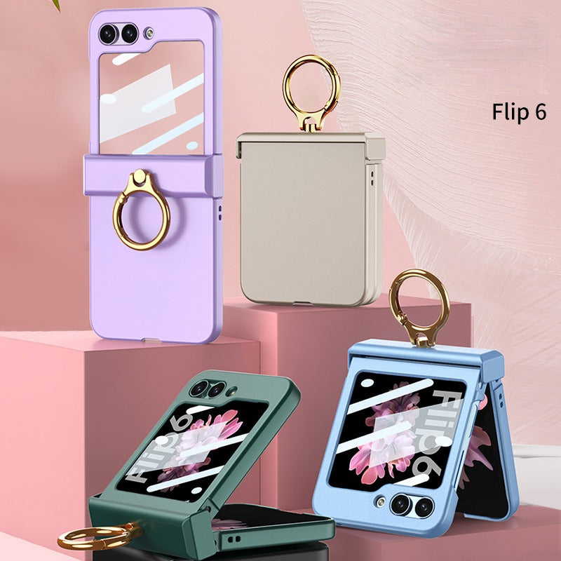Fashion Ultra-thin Matte Case for Samsung Galaxy Z Flip 6 Hinge All-inclusive Ring Holder Support Wireless Charging Anti-drop Cover With Tempered Glass