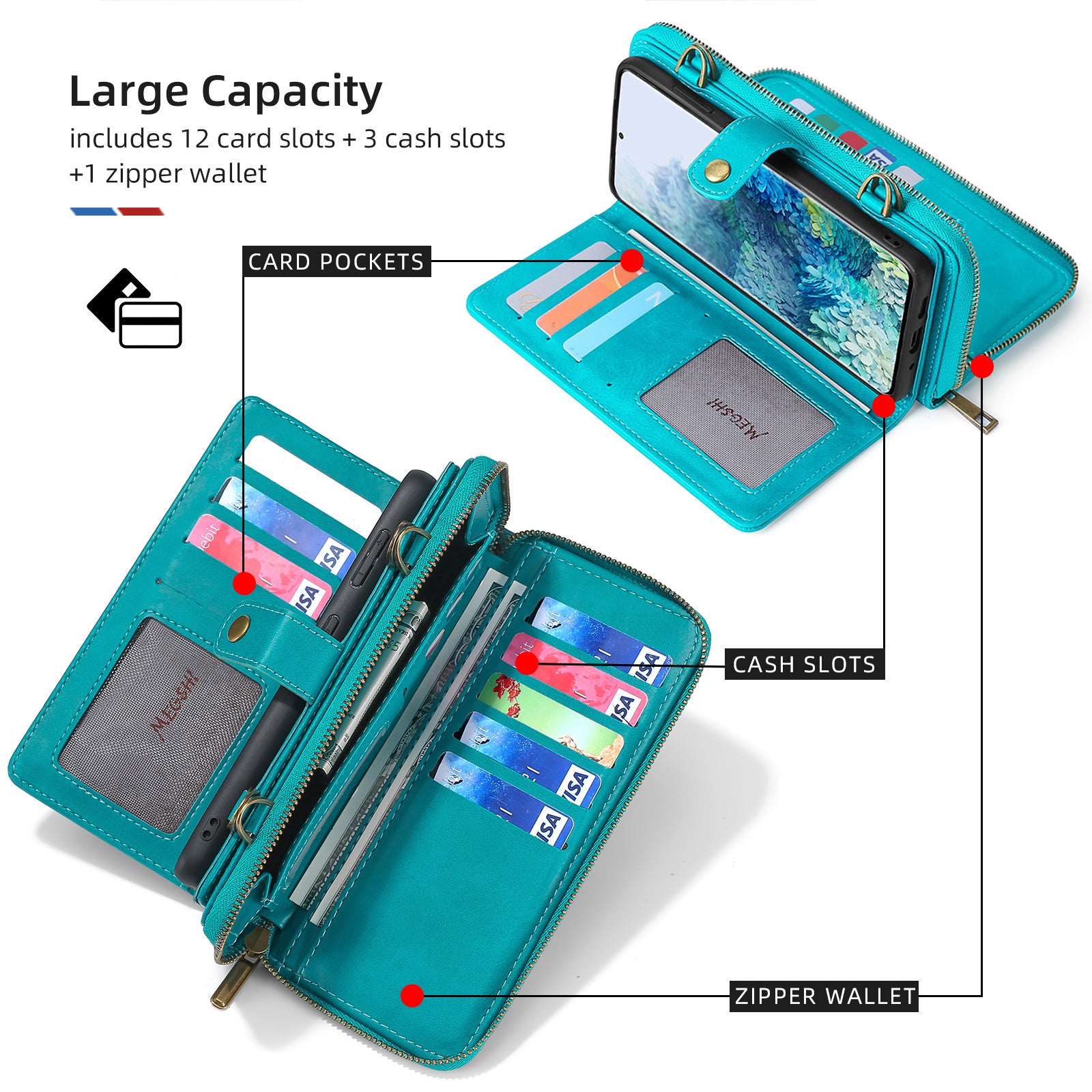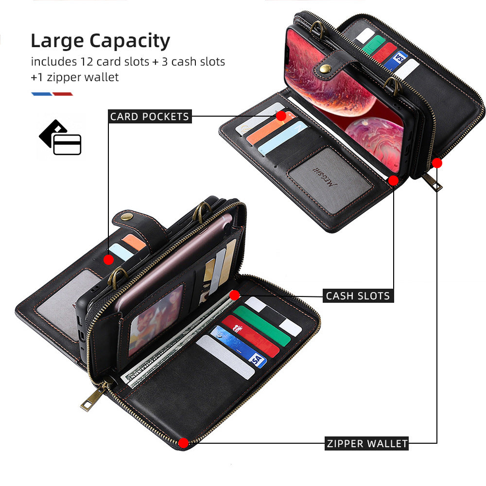 For iPhone 14 15 Pro Max 13 12 Large Capacity 13 Card Slots Magnetic Wallet Case Zipper Removable Leather Women Wallet Flip Card Retractable Magnetic Case Cover